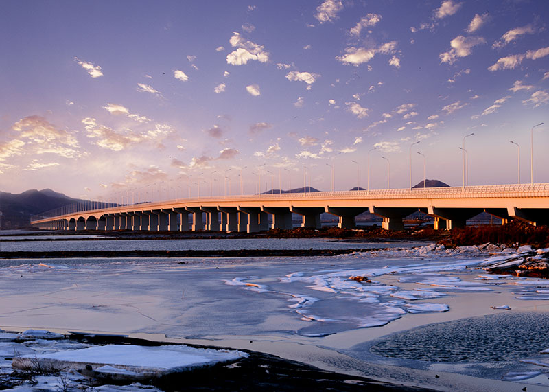 大橋工程分為主橋、預(yù)制段引橋和北側(cè)現(xiàn)澆段引橋,其中主橋長500米,主跨為120米的大跨變截面預(yù)應(yīng)力混凝土連續(xù)箱梁,是當(dāng)時東北地區(qū)跨度最大的連續(xù)梁跨海橋。大橋的設(shè)計結(jié)合了使用和景觀的雙重功能,作為普灣經(jīng)濟(jì)區(qū)核心位置的地標(biāo)性景觀,獨(dú)具特色的夜景設(shè)計使其成為經(jīng)濟(jì)區(qū)一道亮麗的風(fēng)景線。